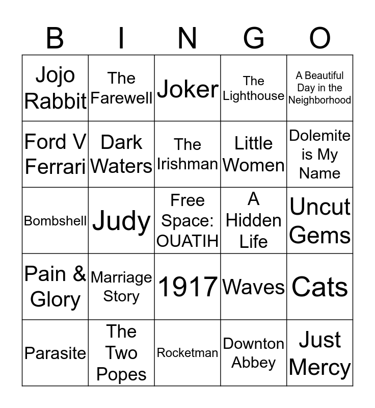 This bingo card has a free space and 24 words: Marriage Story, The Two Popes, The Irishman, Parasite, A Beautiful Day in the Neighborhood, Jojo Rabbit, Ford V Ferrari, The Farewell, A Hidden Life, 1917, Little Women, Bombshell, Waves, Cats, Dark Waters, Downton Abbey, Uncut Gems, Joker, Dolemite is My Name, Judy, Just Mercy, Pain & Glory, The Lighthouse and Rocketman.