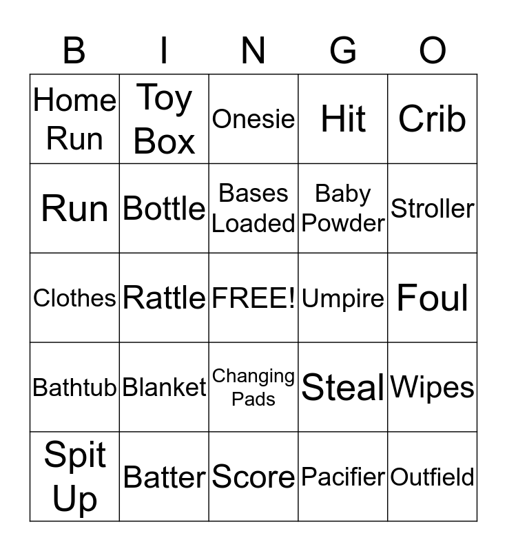This bingo card has a free space and 24 words: Blanket, Batter, Bases Loaded, Spit Up, Crib, Home Run, Run, Toy Box, Umpire, Changing Pads, Baby Powder, Clothes, Steal, Wipes, Bottle, Pacifier, Foul, Onesie, Stroller, Rattle, Outfield, Bathtub, Hit and Score.