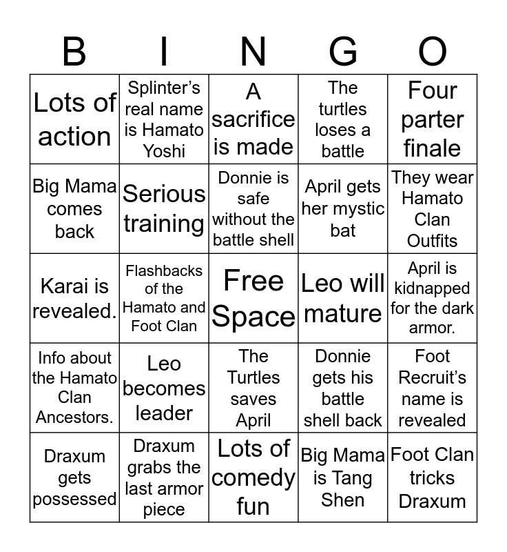 This bingo card has a free space and 24 words: Leo becomes leader, Draxum grabs the last armor piece, Donnie is safe without the battle shell, Draxum gets possessed, Four parter finale, Lots of action, Big Mama comes back, Splinter’s real name is Hamato Yoshi, Leo will mature, The Turtles saves April, April gets her mystic bat, Karai is revealed., Donnie gets his battle shell back, Foot Recruit’s name is revealed, Serious training, Big Mama is Tang Shen, April is kidnapped for the dark armor., A sacrifice is made, They wear Hamato Clan Outfits, Flashbacks of the Hamato and Foot Clan, Foot Clan tricks Draxum, Info about the Hamato Clan Ancestors., The turtles loses a battle and Lots of comedy fun.