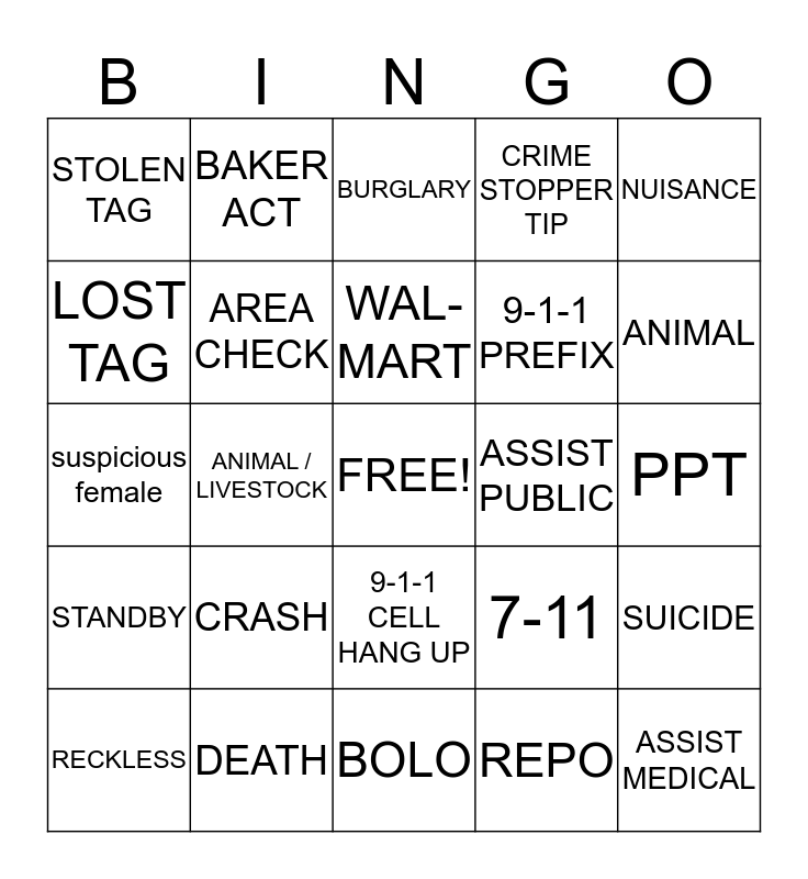 This bingo card has a free space and 24 words: CRASH, DEATH, WAL-MART, RECKLESS, NUISANCE, STOLEN TAG, LOST TAG, BAKER ACT, ASSIST PUBLIC, 9-1-1 CELL HANG UP, 9-1-1 PREFIX, suspicious female, 7-11, SUICIDE, AREA CHECK, REPO, PPT, BURGLARY, ANIMAL, ANIMAL / LIVESTOCK, ASSIST MEDICAL, STANDBY, CRIME STOPPER TIP and BOLO.