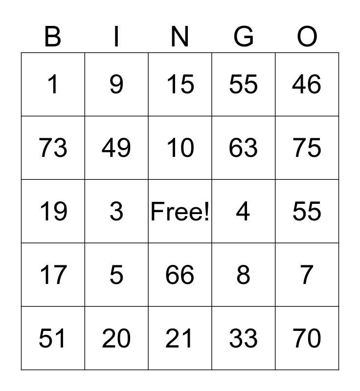 This bingo card has a free space and 24 words: 5, 20, 10, 51, 46, 1, 73, 9, 4, 66, 63, 19, 8, 7, 49, 33, 55, 15, 75, 3, 70, 17, 55 and 21.