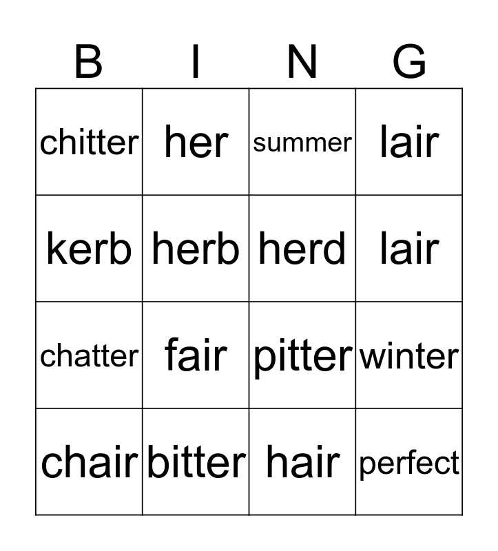 This bingo card has 16 words: bitter, winter, summer, chitter, chatter, her, pitter, hair, kerb, herb, chair, lair, fair, lair, herd and perfect.