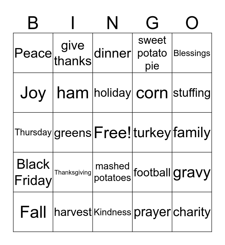 This bingo card has a free space and 24 words: Thanksgiving, harvest, holiday, Fall, Blessings, Peace, Joy, give thanks, turkey, mashed potatoes, corn, Thursday, football, gravy, ham, prayer, family, dinner, stuffing, greens, charity, Black Friday, sweet potato pie and Kindness.