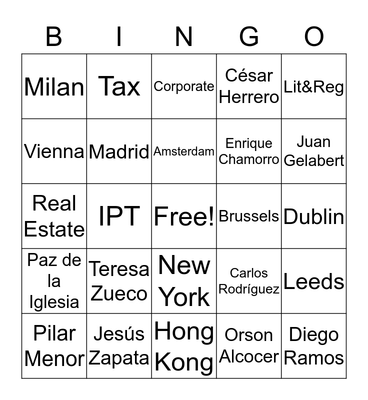 This bingo card has a free space and 29 words: Pilar Menor, London, IPT, Javier Santos, Milan, Corporate, Madrid, Teresa Zueco, Brussels, Jesús Zapata, Dublin, Diego Ramos, Hong Kong, Orson Alcocer, Juan Gelabert, Labour, New York, Paz de la Iglesia, Lit&Reg, Real Estate, Carlos Rodríguez, Warsaw, Enrique Chamorro, Vienna, César Herrero, Tax, Leeds, Amsterdam and Borja de Obeso.
