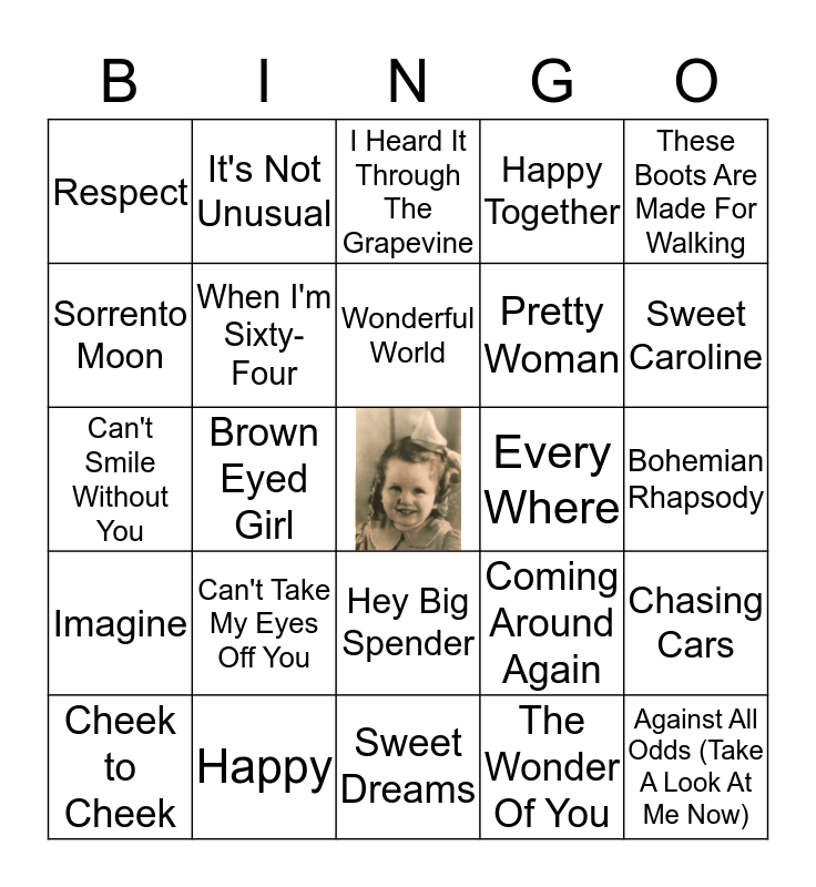 This bingo card has a free space and 29 words: Cheek to Cheek, Unchained Melody, Brown Eyed Girl, Dancing Queen, Respect, I Heard It Through The Grapevine, When I'm Sixty-Four, Can't Take My Eyes Off You, Every Where, Happy, Bohemian Rhapsody, Against All Odds (Take A Look At Me Now), Sweet Dreams, The Wonder Of You, Sweet Caroline, Jackson, Hey Big Spender, Imagine, These Boots Are Made For Walking, Can't Smile Without You, Coming Around Again, Faith, Pretty Woman, Sorrento Moon, Happy Together, It's Not Unusual, Chasing Cars, Wonderful World and Tower of Strength.