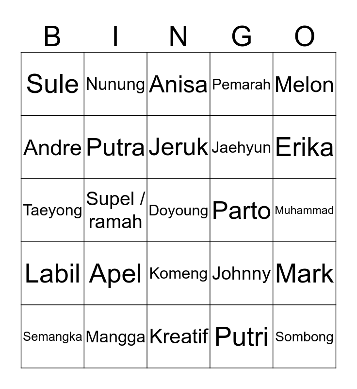 This bingo card has a free space and 24 words: Apel, Mangga, Jeruk, Semangka, Melon, Sule, Andre, Nunung, Parto, Komeng, Jaehyun, Taeyong, Johnny, Mark, Putra, Putri, Muhammad, Anisa, Erika, Supel / ramah, Sombong, Labil, Pemarah and Kreatif.