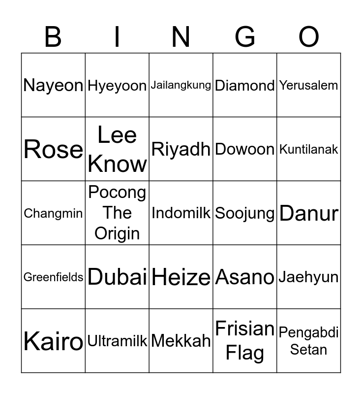 This bingo card has 25 words: Dubai, Mekkah, Riyadh, Kairo, Yerusalem, Nayeon, Rose, Hyeyoon, Soojung, Heize, Dowoon, Changmin, Asano, Jaehyun, Lee Know, Pengabdi Setan, Danur, Jailangkung, Kuntilanak, Pocong The Origin, Indomilk, Ultramilk, Greenfields, Diamond and Frisian Flag.