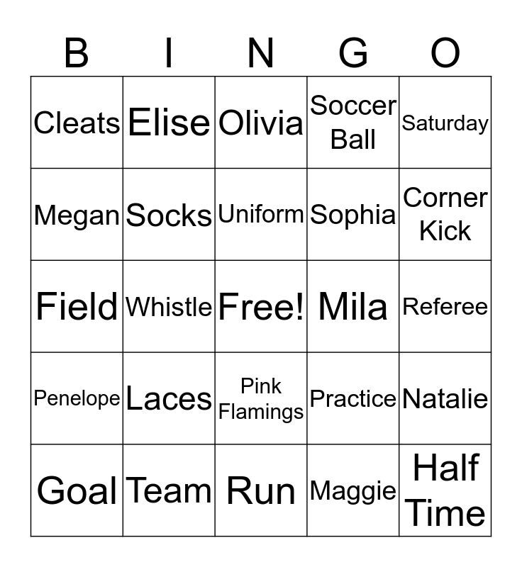 This bingo card has a free space and 28 words: Natalie, Aubrey, Sophia, Maggie, Megan, Olivia, Elise, Penelope, Mila, Goal, Field, Soccer Ball, Team, Run, Corner Kick, Shin Guards, Laces, Socks, Uniform, Pink Flamings, Cleats, Coach, Half Time, Whistle, Referee, Practice, Saturday and Water Bottle.