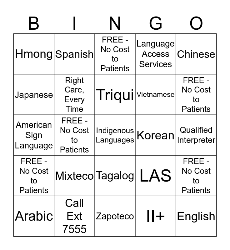 This bingo card has 25 words: Mixteco, Zapoteco, Triqui, Arabic, Chinese, Hmong, Japanese, Spanish, Korean, Tagalog, Vietnamese, American Sign Language, LAS, FREE - No Cost to Patients, Right Care, Every Time, English, Qualified Interpreter, FREE - No Cost to Patients, FREE - No Cost to Patients, FREE - No Cost to Patients, Indigenous Languages, Call Ext 7555, FREE - No Cost to Patients, Language Access Services and II+.