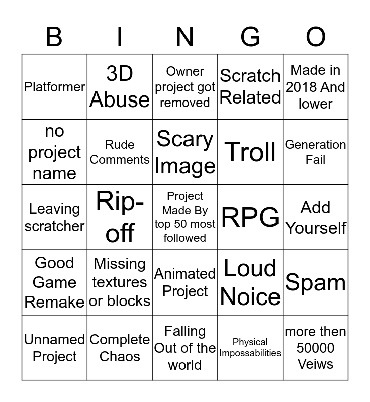 This bingo card has 50 words: More then 100 Favorates or loves, Complete Chaos, Quiz, Fight Project, Add Yourself, Bug Showcase, 3D Abuse, Blank Project, Troll, Image Abuse, Platformer, Rude Comments, Project Made By top 50 most followed, Physical Impossabilities, dont forget to like n favorate in end, Game Content, Rip-off, Scary Image, School related, Made in 2018 And lower, Leaving scratcher, No Credit To original Owner, Owner project got removed, RPG, Hacked, Good Game Remake, Missing textures or blocks, broken in 3.0, Scratch Related, Spam, Animals, Closed Project, Dumb Project Name, meme Related, Bad Project, Unnamed Project, Glitchy Project, Falling Out of the world, Scratch team remixed, Generation Fail, Project Crash, Made 1 week ago or higher, Animated Project, Project Made by somebody i disklike, more then 50000 Veiws, no project name, Blocked or quitted scratcher, In a Nutshell, Loud Noice and Unfitting Music.