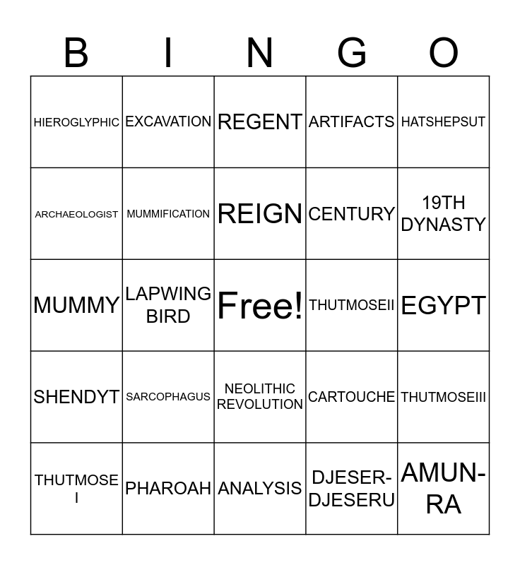 This bingo card has a free space and 24 words: SARCOPHAGUS, PHAROAH, REIGN, THUTMOSE I, HATSHEPSUT, HIEROGLYPHIC, ARCHAEOLOGIST, EXCAVATION, THUTMOSEII, NEOLITHIC REVOLUTION, CENTURY, MUMMY, CARTOUCHE, THUTMOSEIII, MUMMIFICATION, DJESER-DJESERU, EGYPT, REGENT, 19TH DYNASTY, LAPWING BIRD, AMUN-RA, SHENDYT, ARTIFACTS and ANALYSIS.