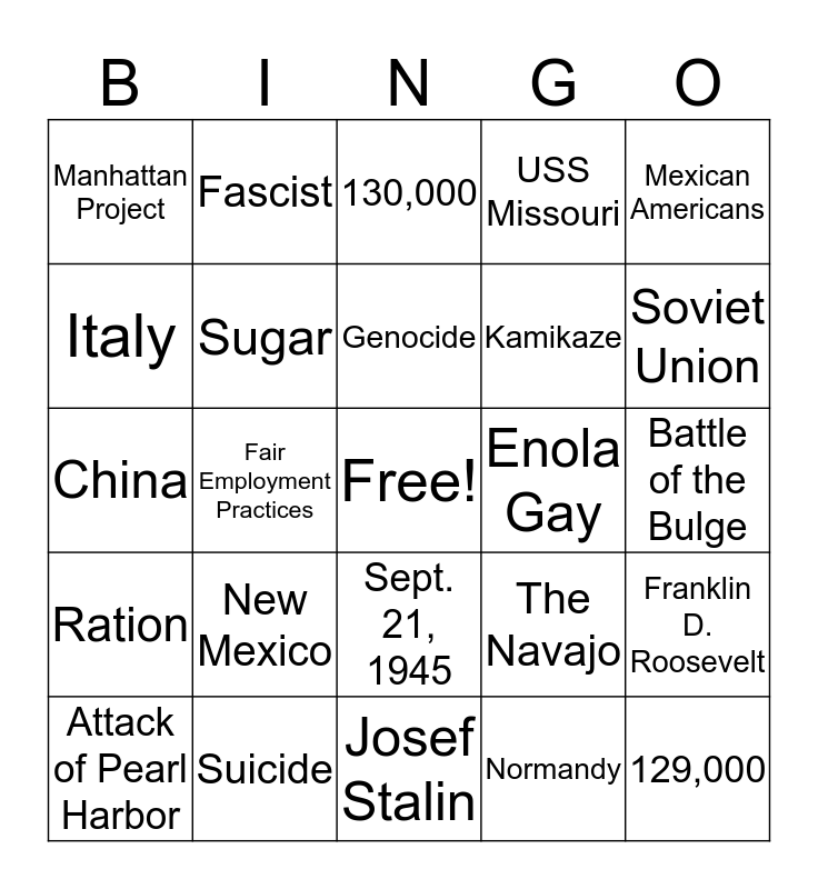 This bingo card has a free space and 36 words: Iwo Jima, V-J Day, Tires, Sugar, The Navajo, Ration, Genocide, Winston Churchill, Mexican Americans, Women, Fair Employment Practices, USS Missouri, War Crimes, Enola Gay, Soviet Union, Manhattan Project, Nagasaki, New Mexico, 129,000, 130,000, Battle of the Bulge, Franklin D. Roosevelt, Suicide, Attack of Pearl Harbor, Josef Stalin, Fascist, China, Internment Camps, Kamikaze, Italy, Harry S. Truman, Sept. 1,1939, Normandy, Sept. 21, 1945, Axis and Allies and V-E Day.