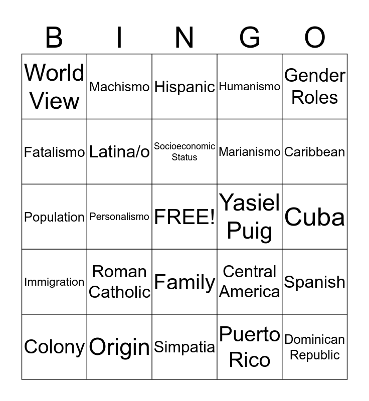 This bingo card has a free space and 31 words: Simpatia, Respeto, Personalismo, Patriarchal, World View, Hispanic, Latina/o, Central America, Yasiel Puig, Puerto Rico, Cuba, Dominican Republic, Territory, Political, Caribbean, Island, Spanish, Roman Catholic, Immigration, Family, Gender Roles, Culture, Colony, Machismo, Marianismo, Fatalismo, Humanismo, Population, Origin, Socioeconomic Status and Familismo.