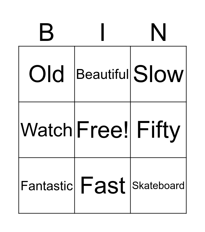 This bingo card has a free space and 10 words: Fast, Slow, Old, Skateboard, Watch, Fantastic, Beautiful, New, Fifty and Short.
