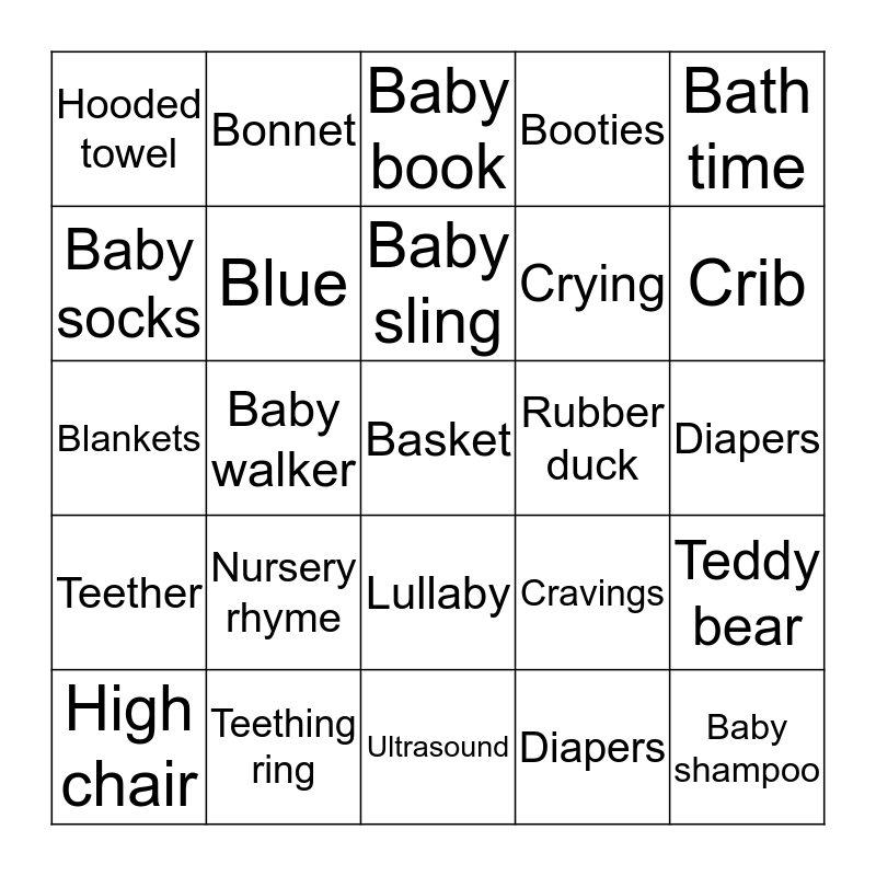 This bingo card has 75 words: Baby, Baby bathtub, Baby book, Baby carrier, Baby food, Baby hat, Baby lotion, Baby monitor, Baby ointment, Baby powder, Baby shampoo, Baby shirt, Baby sling, Baby socks, Baby swing, Baby walker, Baby wipes, Basket, Bassinet, Bath time, Bib, Blankets, Blue, Bonnet, Booties, Bottle, Bouncy seat, Boy, Burp cloth, Car seat, Changing table, Clothes, Cradle, Cravings, Crib, Crying, Diaper bag, Diaper pins, Diapers, Diapers, Family, Formula, Gerber, Gifts, Giggles, Grandson, High chair, Hooded towel, Infant carrier, Instant formula, Love, Lullaby, Milk, Mittens, Mobiles, Mommy, Name, Nap time, Newborn, Nursery, Nursery rhyme, Onesie, Pacifier, Playpen, Rattle, Rubber duck, Sippy Cup, Stork, Stroller, Teddy bear, Teether, Teething ring, Toy box, Ultrasound and Wash cloth.