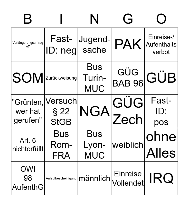 This bingo card has a free space and 24 words: OWI 98 AufenthG, Bus Rom-FRA, Bus Turin-MUC, Einreise Vollendet, Einreise-/ Aufenthalts verbot, Verlängerungsantrag AT, Fast-ID: neg, Jugend-sache, GÜG Zech, Fast-ID: pos, "Grünten, wer hat gerufen", Zurückweisung, weiblich, ohne Alles, SOM, Anlaufbescheinigung, männlich, PAK, GÜB, Art. 6 nichterfüllt, Versuch § 22 StGB, Bus Lyon-MUC, GÜG BAB 96 and IRQ.