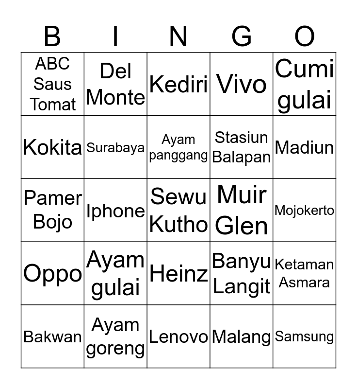 This bingo card has a free space and 24 words: Ayam gulai, Ayam goreng, Ayam panggang, Bakwan, Cumi gulai, ABC Saus Tomat, Kokita, Del Monte, Muir Glen, Heinz, Stasiun Balapan, Pamer Bojo, Banyu Langit, Ketaman Asmara, Surabaya, Malang, Mojokerto, Kediri, Madiun, Iphone, Samsung, Oppo, Vivo and Lenovo.
