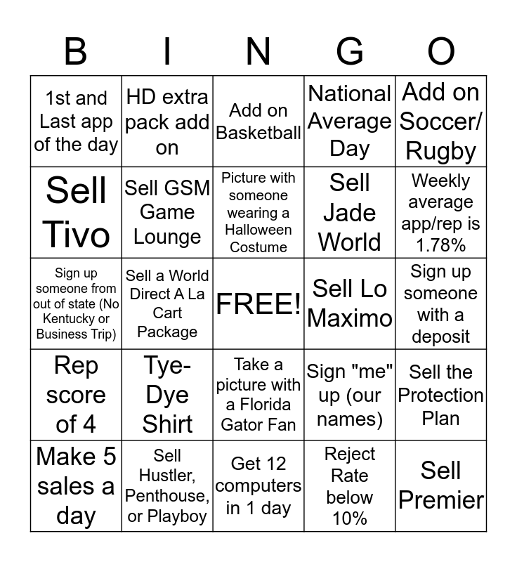 This bingo card has a free space and 25 words: Tye-Dye Shirt, Get 12 computers in 1 day, Picture with someone wearing a Halloween Costume, Make 5 sales a day, Add on Soccer/ Rugby, 1st and Last app of the day, Sell Tivo, HD extra pack add on, Sell Lo Maximo, Take a picture with a Florida Gator Fan, Sell Jade World, Sign up someone from out of state (No Kentucky or Business Trip), Sign "me" up (our names), Sell the Protection Plan, Sell GSM Game Lounge, Make a sale on Tues/Wed, Sign up someone with a deposit, Add on Basketball, Weekly average app/rep is 1.78%, Sell a World Direct A La Cart Package, Sell Premier, Sell Hustler, Penthouse, or Playboy, Rep score of 4, National Average Day and Reject Rate below 10%.