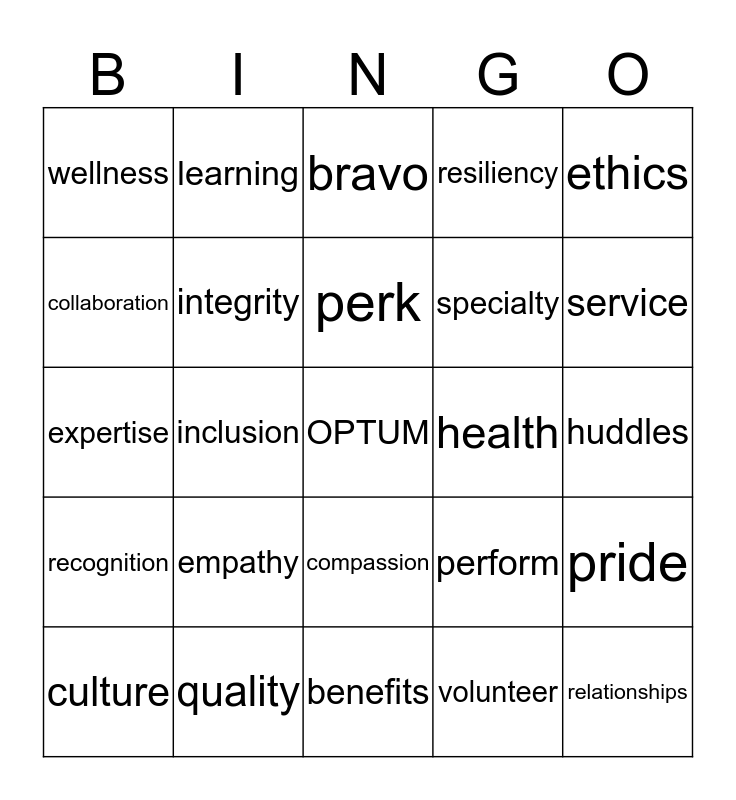 This bingo card has a free space and 39 words: insurance, values, people, integrity, culture, compassion, perk, diversity, ethics, recognition, inclusion, resiliency, relationships, huddles, health, empathy, balance, wellness, innovation, perform, collaboration, benefits, specialty, service, advance, achieve, care, stride, respect, learning, goals, united, bravo, quality, volunteer, family, pride, expertise and passion.
