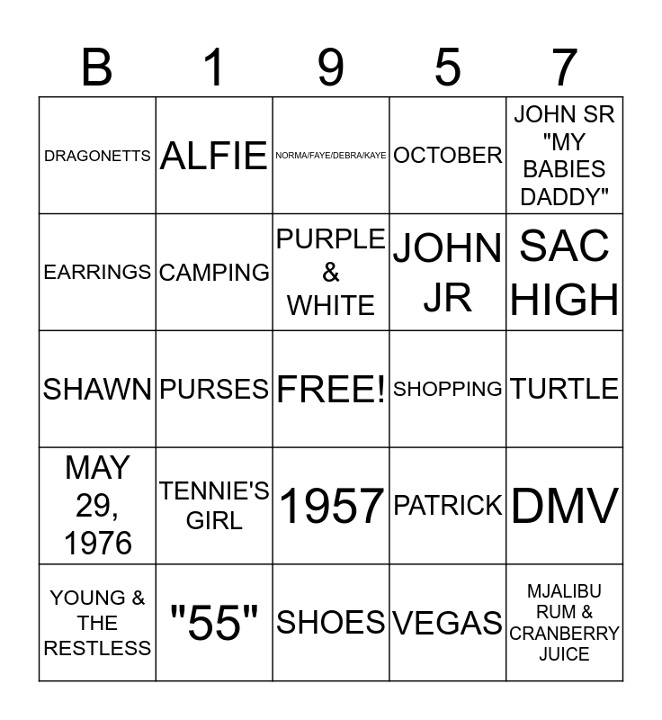 This bingo card has a free space and 24 words: TENNIE'S GIRL, "55", PURPLE & WHITE, YOUNG & THE RESTLESS, JOHN SR "MY BABIES DADDY", DRAGONETTS, EARRINGS, ALFIE, SHOPPING, 1957, JOHN JR, SHAWN, PATRICK, DMV, CAMPING, VEGAS, TURTLE, NORMA/FAYE/DEBRA/KAYE, SAC HIGH, PURSES, MJALIBU RUM & CRANBERRY JUICE, MAY 29, 1976, OCTOBER and SHOES.