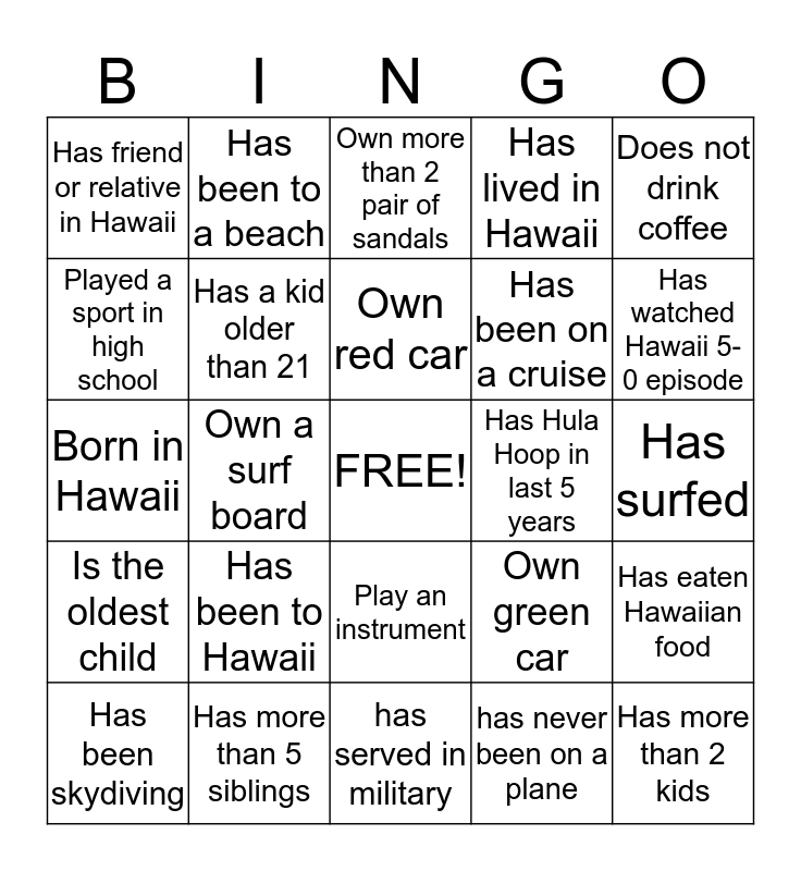 This bingo card has a free space and 24 words: Has been to Hawaii, Has more than 5 siblings, Own red car, Has been skydiving, Does not drink coffee, Has friend or relative in Hawaii, Played a sport in high school, Has been to a beach, Has Hula Hoop in last 5 years, Play an instrument, Has been on a cruise, Born in Hawaii, Own green car, Has eaten Hawaiian food, Has a kid older than 21, has never been on a plane, Has surfed, Own more than 2 pair of sandals, Has watched Hawaii 5-0 episode, Own a surf board, Has more than 2 kids, Is the oldest child, Has lived in Hawaii and has served in military.