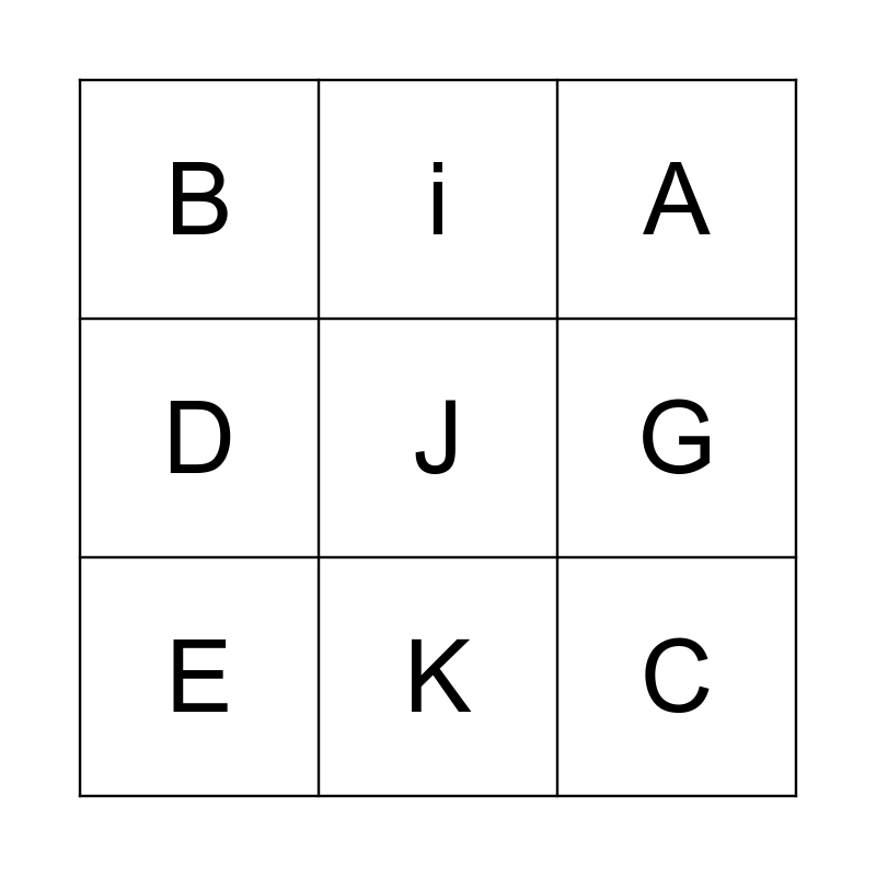 This bingo card has a free space and 10 words: K, A, B, C, D, E, i, F, G and H.