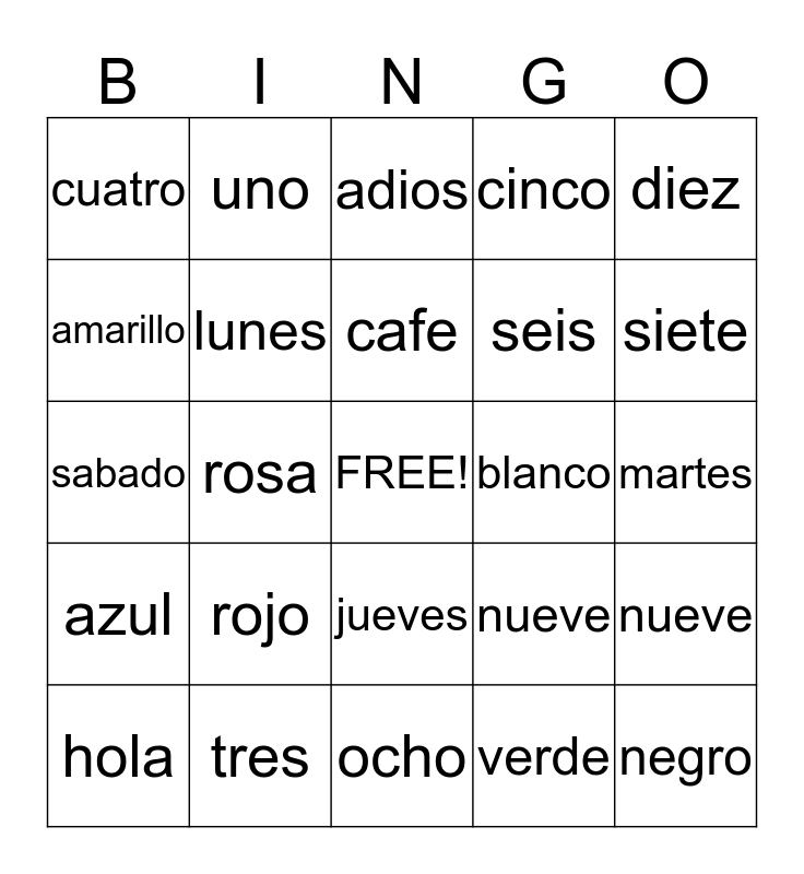 This bingo card has a free space and 24 words: rojo, tres, cafe, hola, diez, cuatro, amarillo, uno, blanco, jueves, seis, sabado, nueve, nueve, lunes, verde, martes, adios, siete, rosa, negro, azul, cinco and ocho.