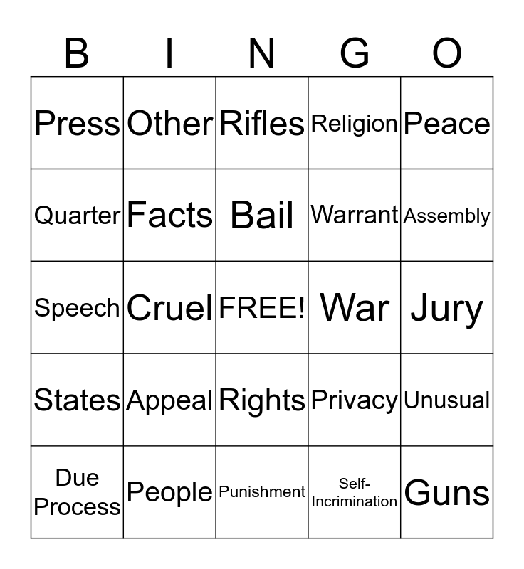 This bingo card has a free space and 35 words: Petition, Soldiers, Jury, Facts, Rights, Religion, Quarter, 1 Trial, Bail, Enumerated, Speech, Peace, Fines, Power, Press, War, Self-Incrimination, Cruel, States, Guns, Privacy, Due Process, Unusual, People, Rifles, Assembly, Search, Seizure, Warrant, Jury, Witness, Punishment, Appeal, Other and True.