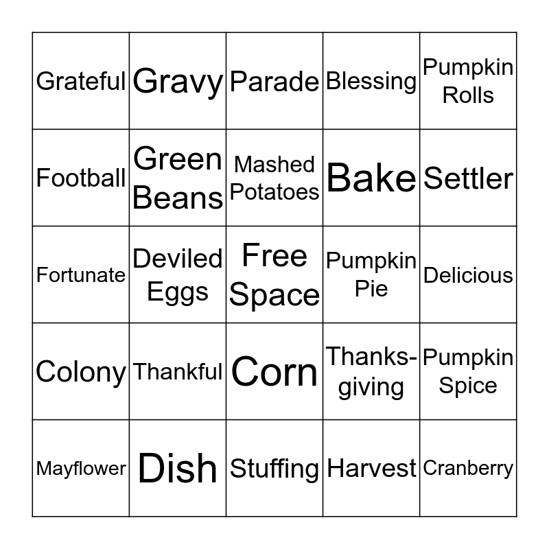 This bingo card has a free space and 49 words: Turkey, Cranberry, Apple Pie, Stuffing, Thankful, Ham, Gravy, Gobble, Football, Autumn, Green Beans, Blessing, Pumpkin Spice, Thanks-giving, Yams, Feast, Mashed Potatoes, Pumpkin Pie, Rolls, Pumpkin Rolls, Deviled Eggs, Harvest, Grateful, Bake, Hunting, Settler, Mayflower, Pilgrims, Corn, Colony, Dessert, Black Friday, Eat, Cyber Monday, Dish, Family, Giblets, Chicken & Dumplings, Delicious, Chicken, November, Mac and Cheese, Dinner, Friends, Fortunate, Parade, Home-cooked, Oven and Gracious.