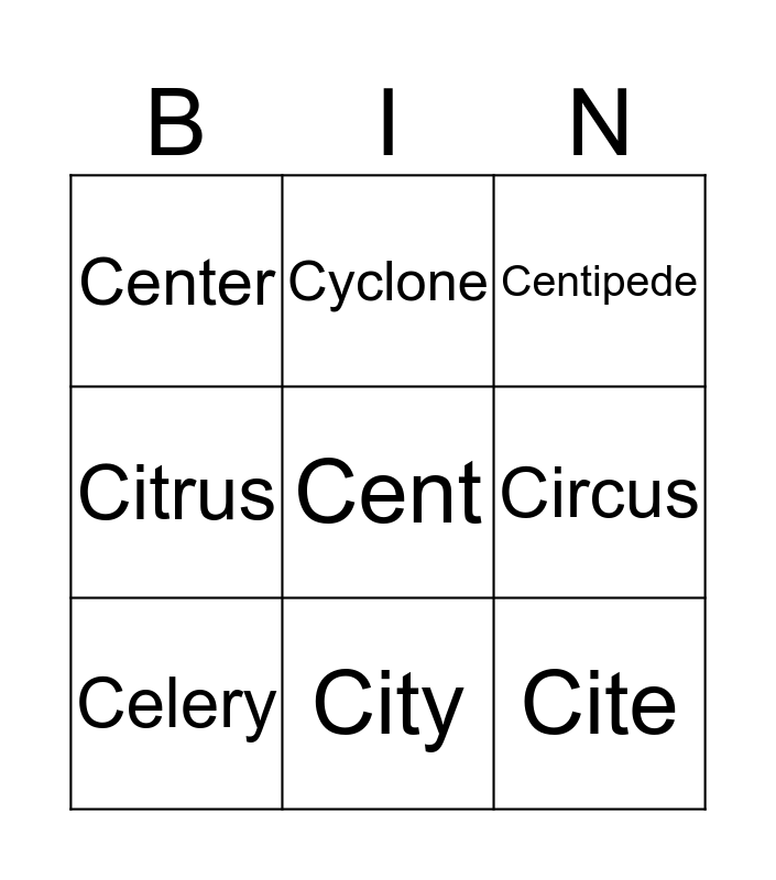 This bingo card has a free space and 10 words: City, Centipede, Center, Cite, Citrus, Celery, Cyclone, Cycle, Circus and Cement.