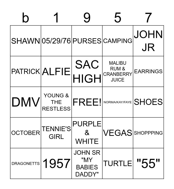 This bingo card has a free space and 24 words: TENNIE'S GIRL, 1957, SAC HIGH, DRAGONETTS, JOHN JR, SHAWN, PATRICK, 05/29/76, NORMA/KAY/FAYE, PURPLE & WHITE, MALIBU RUM & CRANBERRY JUICE, DMV, VEGAS, SHOPPPING, ALFIE, TURTLE, SHOES, PURSES, EARRINGS, YOUNG & THE RESTLESS, "55", OCTOBER, CAMPING and JOHN SR "MY BABIES DADDY".