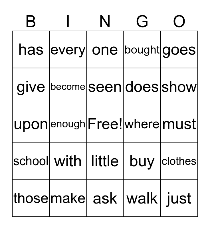 This bingo card has a free space and 24 words: with, make, seen, those, goes, has, give, every, where, little, does, upon, buy, clothes, become, walk, must, one, show, enough, just, school, bought and ask.