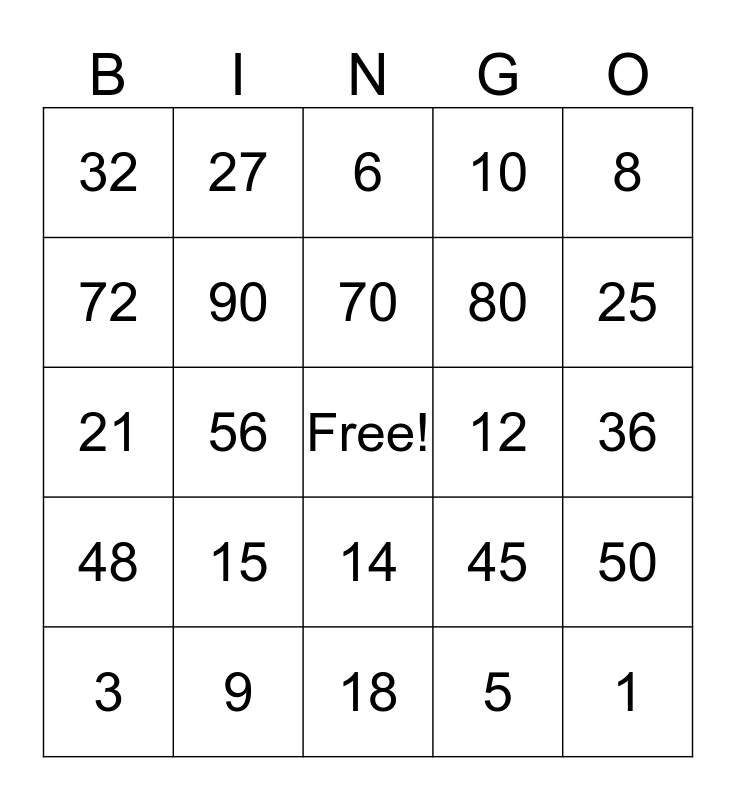 This bingo card has a free space and 43 words: 0, 1, 2, 3, 4, 5, 6, 7, 8, 9, 10, 12, 14, 15, 16, 18, 20, 21, 24, 25, 27, 28, 30, 32, 35, 36, 40, 42, 45, 48, 49, 50, 54, 56, 60, 63, 64, 70, 72, 80, 81, 90 and 100.