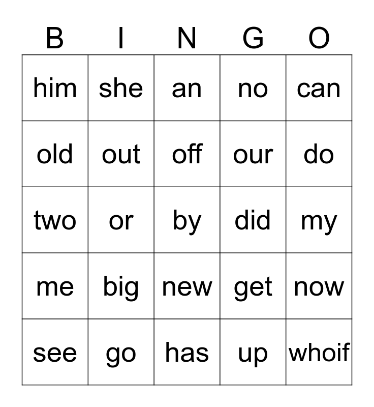 This bingo card has 25 words: big, has, off, see, can, him, old, she, did, new, our, two, get, now, out, whoif, my, an, do, or, by, go, me, no and up.