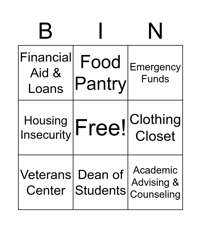 This bingo card has a free space and 8 words: Clothing Closet, Emergency Funds, Food Pantry, Veterans Center, Financial Aid & Loans, Academic Advising & Counseling, Housing Insecurity and Dean of Students.