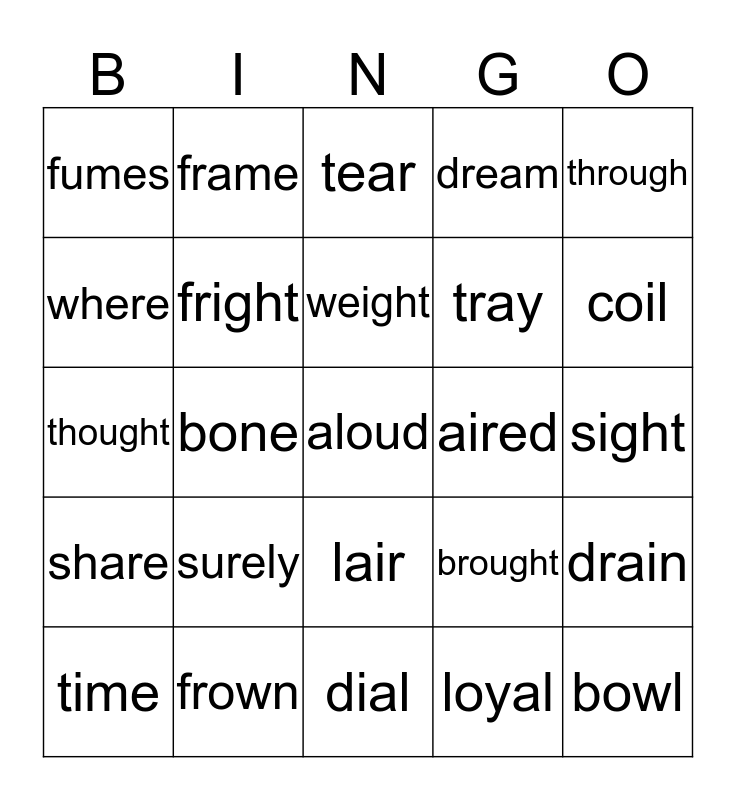 This bingo card has a free space and 29 words: time, home, bone, game, fumes, tear, fright, surely, aired, frown, sight, bowl, dial, loyal, coil, lied, lair, share, through, thought, brought, caught, tray, where, dream, frame, drain, weight and here.