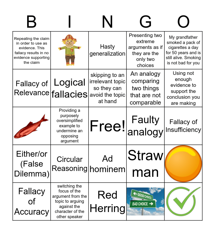 This bingo card has 5 images, a free space and 19 words: Circular Reasoning, switching the focus of the argument from the topic to arguing against the character of the other speaker, skipping to an irrelevant topic so they can avoid the topic at hand, Fallacy of Accuracy, My grandfather smoked a pack of cigarettes a day for 50 years and is still alive. Smoking is not bad for you, Repeating the claim in order to use as evidence. This fallacy results in no evidence supporting the claim, Fallacy of Relevance, Faulty analogy, Ad hominem, An analogy comparing two things that are not comparable, Straw man, Logical fallacies, Fallacy of Insufficiency, Hasty generalization, Using not enough evidence to support the conclusion you are making, Providing a purposely oversimplified example to undermine an opposing argument, Either/or (False Dilemma), Presenting two extreme arguments as if they are the only two choices and Red Herring.