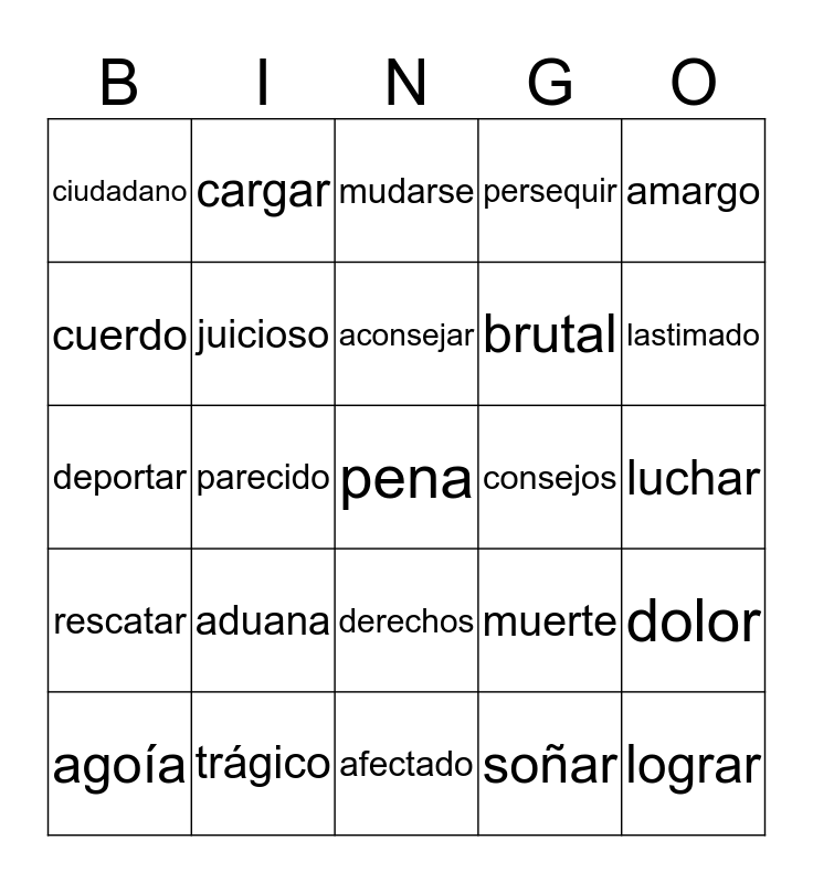 This bingo card has 25 words: aduana, afectado, aconsejar, agoía, amargo, ciudadano, cuerdo, cargar, consejos, derechos, brutal, deportar, muerte, dolor, juicioso, lograr, luchar, mudarse, lastimado, parecido, pena, trágico, rescatar, persequir and soñar.