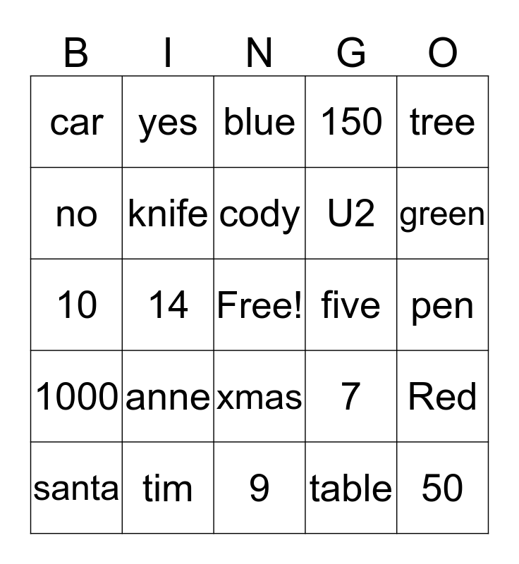 This bingo card has a free space and 24 words: anne, tim, cody, santa, tree, car, no, yes, five, xmas, U2, 10, 7, Red, knife, table, pen, blue, green, 14, 50, 1000, 150 and 9.