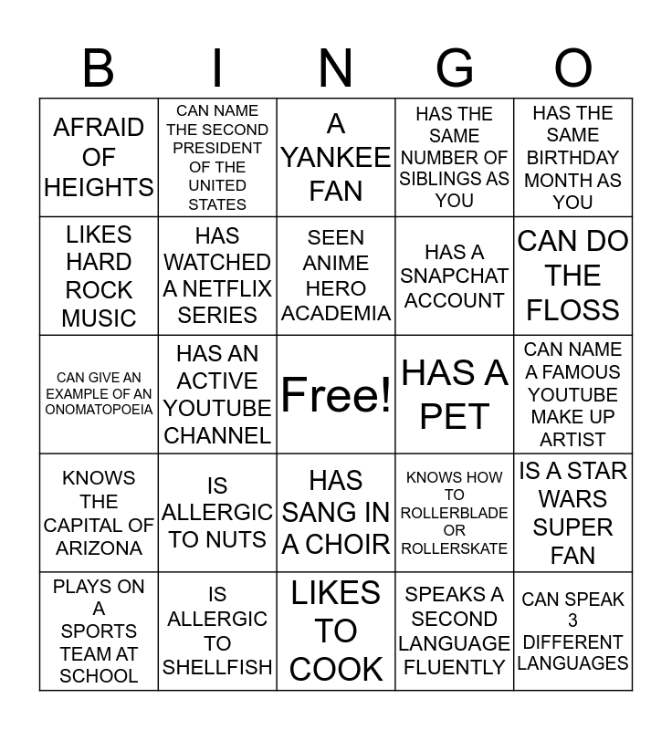 This bingo card has a free space and 55 words: LOVES ANIMES, PLAYS ON A SPORTS TEAM AT SCHOOL, TRAVELED OUTSIDE THE COUNTRY, AFRAID OF HEIGHTS, LIKES TO COOK, HAS BEEN CAMPING, HAS WATCHED A NETFLIX SERIES, PLAYS A MUSICAL INSTRUMENT, HAS A SNAPCHAT ACCOUNT, HAS MADE A SCIENDE FAIR PROJECT, HAS THE SAME NUMBER OF SIBLINGS AS YOU, HAS MADE A MEME, VISITED THE STATUE OF LIBERTY, HAS A LIBRARY CARD, IS LEFT HANDED, LIKES BRUSSEL SPROUTS, HAS THE SAME BIRTHDAY MONTH AS YOU, HAS AN ACTIVE YOUTUBE CHANNEL, THE OLDEST CHILD, CAN SPEAK 3 DIFFERENT LANGUAGES, HAS A PET, HAS AN MTA METROCARD, KNOWS HOW TO ROLLERBLADE OR ROLLERSKATE, A YANKEE FAN, IS VEGETARIAN, SEEN ANIME HERO ACADEMIA, SPEAKS A SECOND LANGUAGE FLUENTLY, CAN NAME A CHARACTER FROM DRAGON BALL Z, CAN NAME A FAMOUS YOUTUBE MAKE UP ARTIST, IS A STAR WARS SUPER FAN, HAS ON NAVY PANTS, HAS ON A BLACK SHIRT, CRIED AT AN ANIMATED MOVIE, HAS AN ANDROID, LIKES HARD ROCK MUSIC, CAN GIVE AN EXAMPLE OF AN ONOMATOPOEIA, CAN NAME ALL THE NINJA TURTLES, KNOWS THE CAPITAL OF ARIZONA, KNOWS THE CAPITAL OF TEXAS, KNOWS THE CAPITAL OF IDAHO, CAN NAME THE SECOND PRESIDENT OF THE UNITED STATES, HAS CREATED THEIR OWN FLOOR PLAN, CAN NAME THE CURRENT COMMISSIONER OF DDC, HAS CREATED A POWERPOINT PRESENTATION, IS ALLERGIC TO NUTS, IS ALLERGIC TO SHELLFISH, CAN STATE THE MEANING OF S.T.E.A.M ACRONYM, CAN DO THE MACARENA, CAN DO THE NAE NAE, CAN DO THE FLOSS, WAS BORN IN ANOTHER COUNTRY, CAN NAME A BILLIE EILISH SONG, CAN NAME A TAYLOR SWIFT SONG, HAS SANG IN A CHOIR and IS THE YOUNGEST CHILD.