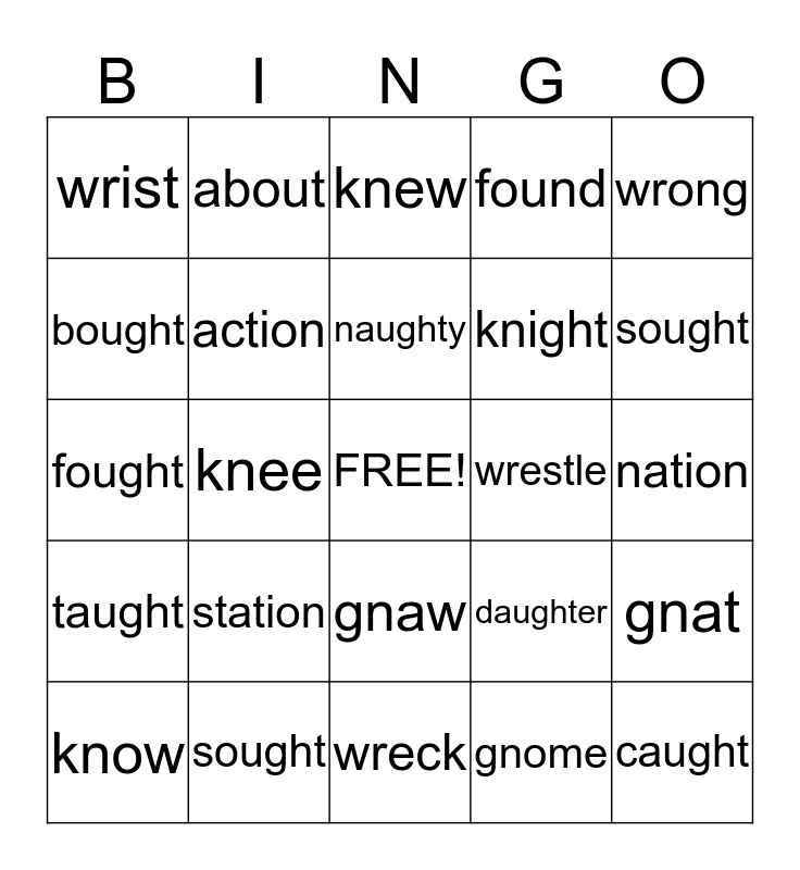 This bingo card has a free space and 24 words: station, sought, naughty, know, wrong, wrist, bought, about, wrestle, gnaw, knight, fought, daughter, gnat, action, gnome, nation, knew, sought, knee, caught, taught, found and wreck.