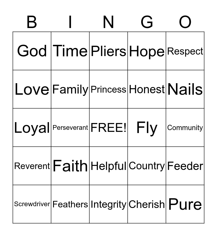 This bingo card has a free space and 24 words: Faith, Feathers, Princess, Screwdriver, Respect, God, Love, Time, Fly, Helpful, Honest, Loyal, Country, Feeder, Family, Cherish, Community, Pliers, Nails, Perseverant, Pure, Reverent, Hope and Integrity.