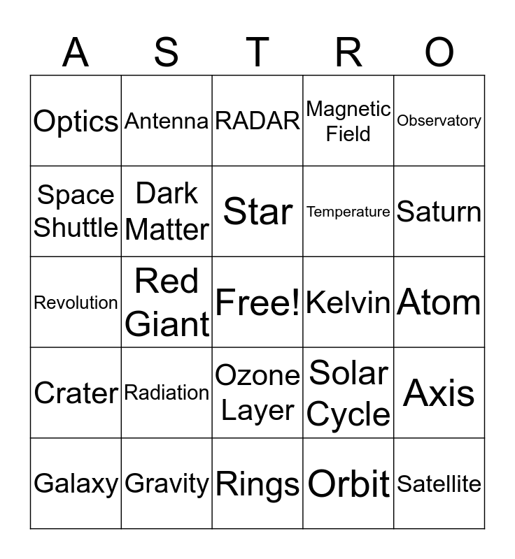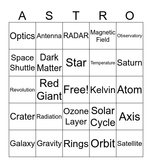 This bingo card has a free space and 42 words: Asteroid, Star, Telescope, Radiation, Orbit, Axis, Satellite, Terrestrial, RADAR, Ozone Layer, Atom, Saturn, Red Giant, Observatory, Aurora Borealis, Solar Cycle, Time, Revolution, Open Cluster, Antenna, Space Shuttle, Theory of Relativity, Rocky Planet, Optics, Astronomy, Solar System, Temperature, Rotation, Oort Cloud, Comet, Constellation, Crater, Dark Matter, Rings, Dwarf, Galaxy, Gravity, Kelvin, Light Year, Lunar Eclipse, Magnetic Field and Mass.