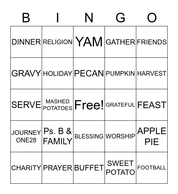 This bingo card has a free space and 29 words: CHARITY, SEASONS, MASHED POTATOES, TURKEY, DINNER, YAM, HOLIDAY, Ps. B & FAMILY, GRATEFUL, PRAYER, FEAST, FOOTBALL, BUFFET, SWEET POTATO, HARVEST, DESSERT, BLESSING, JOURNEY ONE28, FRIENDS, SERVE, WORSHIP, STUFFING, PUMPKIN, GRAVY, GATHER, RELIGION, APPLE PIE, PECAN and SALAD.