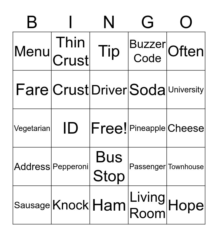 This bingo card has a free space and 35 words: Toppings, pickup, Delivery, Buzzer Code, Townhouse, Vegetarian, Crust, Wings, Soda, Gluten-free, Address, Thin Crust, Wings, Total, Menu, Pepperoni, Ham, Pineapple, Cheese, Sausage, Knock, Tip, Living Room, Hope, Fare, ID, Bus Stop, Express, University, Out of Service, Route, Driver, Passenger, Often and Long.