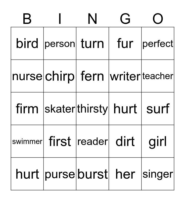 This bingo card has a free space and 24 words: hurt, first, fern, her, perfect, bird, person, turn, hurt, surf, firm, chirp, dirt, girl, nurse, purse, burst, fur, teacher, swimmer, skater, reader, writer and singer.