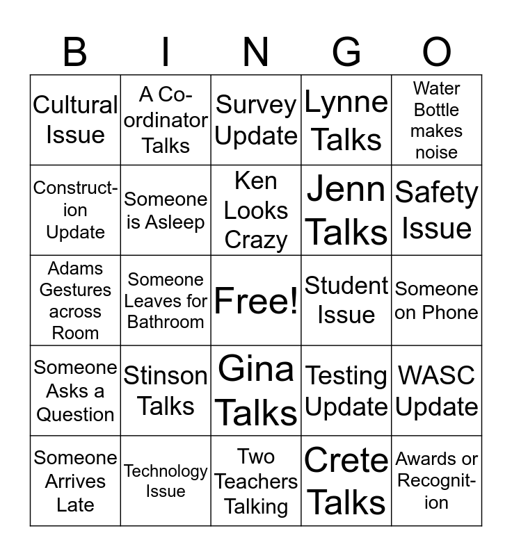 This bingo card has a free space and 24 words: Stinson Talks, Technology Issue, Ken Looks Crazy, Someone Arrives Late, Water Bottle makes noise, Cultural Issue, Construct-ion Update, A Co-ordinator Talks, Student Issue, Gina Talks, Jenn Talks, Adams Gestures across Room, Testing Update, WASC Update, Someone is Asleep, Crete Talks, Someone on Phone, Survey Update, Safety Issue, Someone Leaves for Bathroom, Awards or Recognit-ion, Someone Asks a Question, Lynne Talks and Two Teachers Talking.
