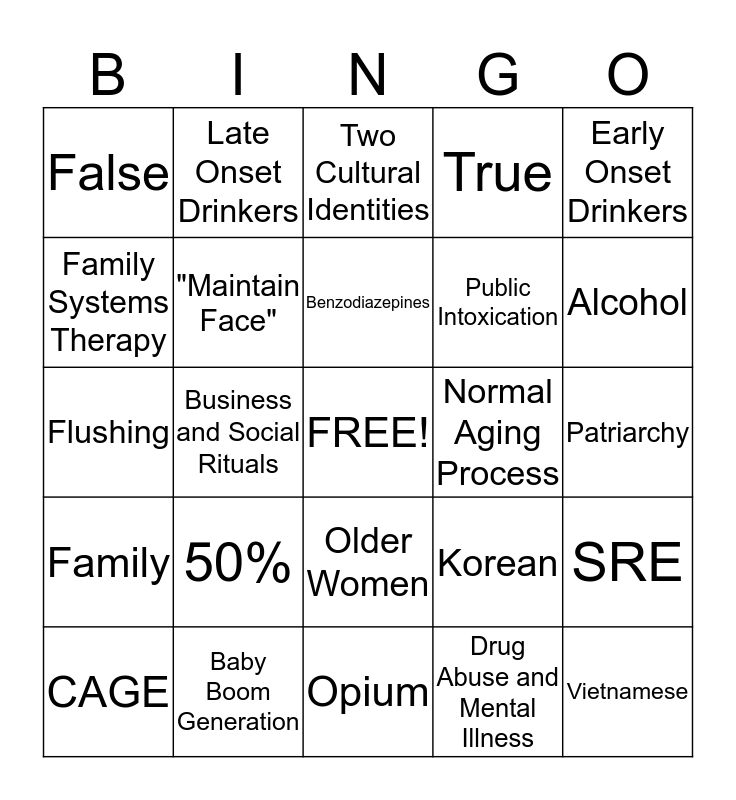 This bingo card has a free space and 24 words: 50%, Baby Boom Generation, Benzodiazepines, CAGE, Early Onset Drinkers, False, Family Systems Therapy, Late Onset Drinkers, Normal Aging Process, Older Women, Public Intoxication, Flushing, Korean, SRE, "Maintain Face", Drug Abuse and Mental Illness, Patriarchy, Two Cultural Identities, Alcohol, Business and Social Rituals, Vietnamese, Family, True and Opium.