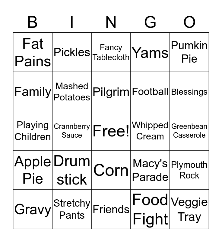 This bingo card has a free space and 39 words: Turkey, Ham, Thankful, Mashed Potatoes, Gravy, Corn, Pilgrim, Mayflower, Pumkin Pie, Apple Pie, Crannberry Sauce, Yams, Veggie Tray, Greenbean Casserole, Whipped Cream, Drum stick, Wishbone, Fat Pains, Food Coma, Macy's Parade, Family, Friends, Football, Blessings, Cheesecake, Gratitude, Laughter, Deviled Eggs, Stuffing, Pickles, Sweet Aroma, Traditions, Fancy Tablecloth, Stretchy Pants, Food Fight, Dirty Dishes, Plymouth Rock, Playing Children and Pots and Pan.