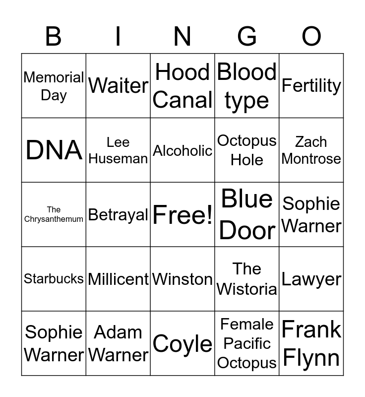 This bingo card has a free space and 29 words: Sophie Warner, Lee Huseman, Betrayal, Conner Moss, Memorial Day, Hood Canal, Lee Huseman, Millicent, Blue Door, Adam Warner, Sophie Warner, Frank Flynn, Coyle, Female Pacific Octopus, Zach Montrose, Parkinsons, Winston, Starbucks, Fertility, The Chrysanthemum, The Wistoria, The Lily, Octopus Hole, DNA, Blood type, Waiter, Lawyer, Alcoholic and Crab fishing.